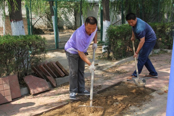 6月15日,郭強(qiáng)、段建平等幾名老同志主動(dòng)到職工菜地勞動(dòng),為菜地除草、澆水。當(dāng)發(fā)現(xiàn)菜地一角堆積了一些廢舊磚塊時(shí),幾名老大哥一商量,干脆廢物利用,用這些磚塊為職工鋪一條采摘小路,大家紛紛表示贊同并積極加入勞動(dòng)隊(duì)伍。小路修好后,干勁高漲的人們又一鼓作氣對(duì)“鼓包”的方磚路面進(jìn)行了修整。