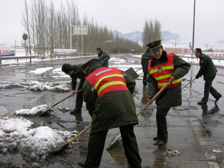 一是根據(jù)下雪時間調(diào)整除雪方案。1日上午一直在下雪,考慮到此時人工除雪效果不大,站領(lǐng)導(dǎo)決定采取灑布融雪劑的方法進(jìn)行除雪,對收費車道、收費廣場、院內(nèi)重點場所揮灑融雪劑,杜絕了積雪增多、結(jié)冰的現(xiàn)象。下午雪停后,則采取了人工除雪的方案。
