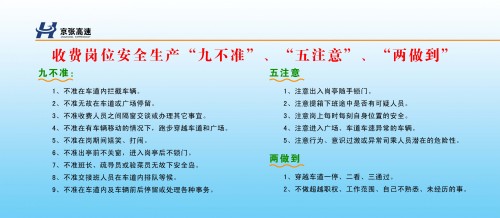 為了增強(qiáng)職工的安全生產(chǎn)意識(shí),切實(shí)將安全生產(chǎn)落實(shí)到收費(fèi)工作中,東花園收費(fèi)站組織職工召開了安全生產(chǎn)座談會(huì),通過總結(jié)收費(fèi)工作中存在的安全隱患,大家群策群力,共同研究編制了易懂、好記又便于操作的《收費(fèi)崗位安全生產(chǎn)“九不準(zhǔn)”、“五注意”和“兩做到”》,要求全體職工必須熟練背會(huì),嚴(yán)格操作,使安全規(guī)范真正扎根在每個(gè)職工的心里,落實(shí)在每個(gè)職工的行動(dòng)上。內(nèi)容包含了交接班、疏導(dǎo)車輛、收費(fèi)過程、非正常處理等各方面應(yīng)該注意且必須遵守的安全規(guī)定。站內(nèi)請(qǐng)專業(yè)人員將此項(xiàng)規(guī)定做成了宣傳展板,懸掛在站區(qū)醒目位置,時(shí)刻提醒收費(fèi)人員在上崗期間要嚴(yán)格執(zhí)行“九不準(zhǔn)”“五注意”“兩做到”。