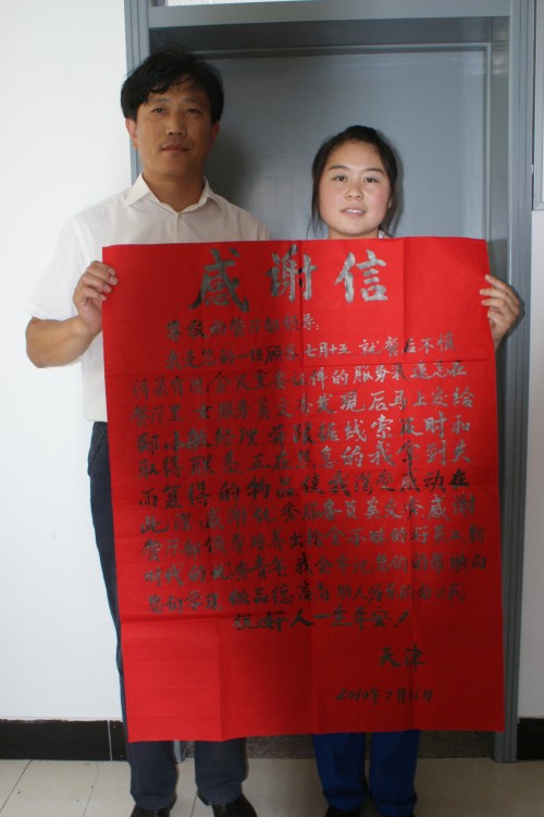 7月15日,一位天津客車司機到官廳服務(wù)區(qū)就餐,因為趕時間走得匆忙,不慎將裝有現(xiàn)金和重要證件的衣服遺落在餐廳。當(dāng)班服務(wù)員奚文秀在撤臺時發(fā)現(xiàn)顧客的衣服后,馬上交給餐廳領(lǐng)班,服務(wù)區(qū)根據(jù)證件等線索聯(lián)系到了該顧客。7月21日,該顧客專程來到服務(wù)區(qū)送來自己寫的感謝信,對服務(wù)人員拾金不昧的行為深表謝意。(官廳服務(wù)區(qū) 張鶴)