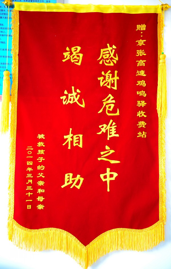 4月15日,雞鳴驛收費站收到了北京市海淀區(qū)寧先生父母專程贈送的寫著“感謝危難之中竭誠相助”的錦旗一幅和感謝信一封,并對雞鳴驛收費站工作人員危難之中伸援手的義舉表示了真摯的謝意。