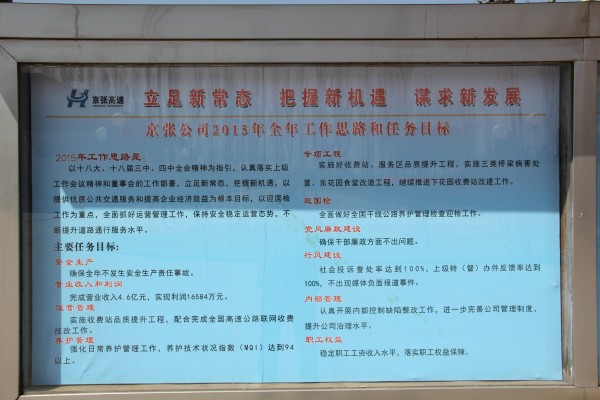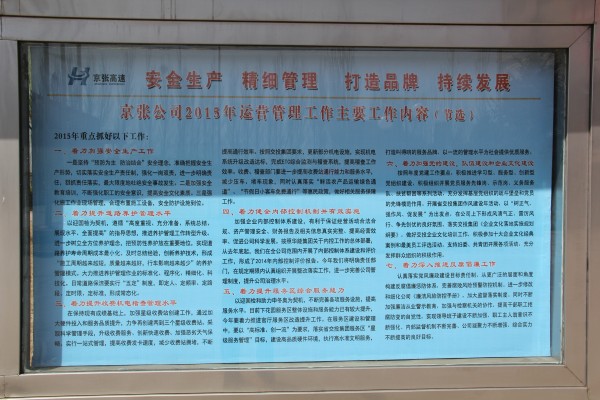 為更好的貫徹公司年度工作會(huì)議精神,總結(jié)上一年工作,分析當(dāng)前形勢(shì),部署新一年各項(xiàng)工作任務(wù),近日,宣化東收費(fèi)站制作公司2015年工作內(nèi)容學(xué)習(xí)展板。展板位于站辦公樓門口醒目位置,分為兩塊,涵蓋了公司新一年的工作思路、任務(wù)目標(biāo)和運(yùn)營(yíng)管理主要工作等方面內(nèi)容,方便了職工學(xué)習(xí),為宣化東站制定新一年的工作目標(biāo)和任務(wù)提供了參考和依據(jù)。(宣化東收費(fèi)站 趙海濤)