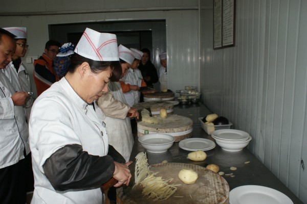 配菜考核內(nèi)容為刀工和抓菜,其中刀工考核切土豆絲和削茄皮,抓菜考核魚香肉絲和木須肉。