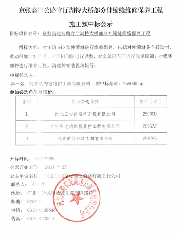 京張高速公路官?gòu)d湖特大橋部分伸縮縫維修保養(yǎng)工程施工預(yù)中標(biāo)公示