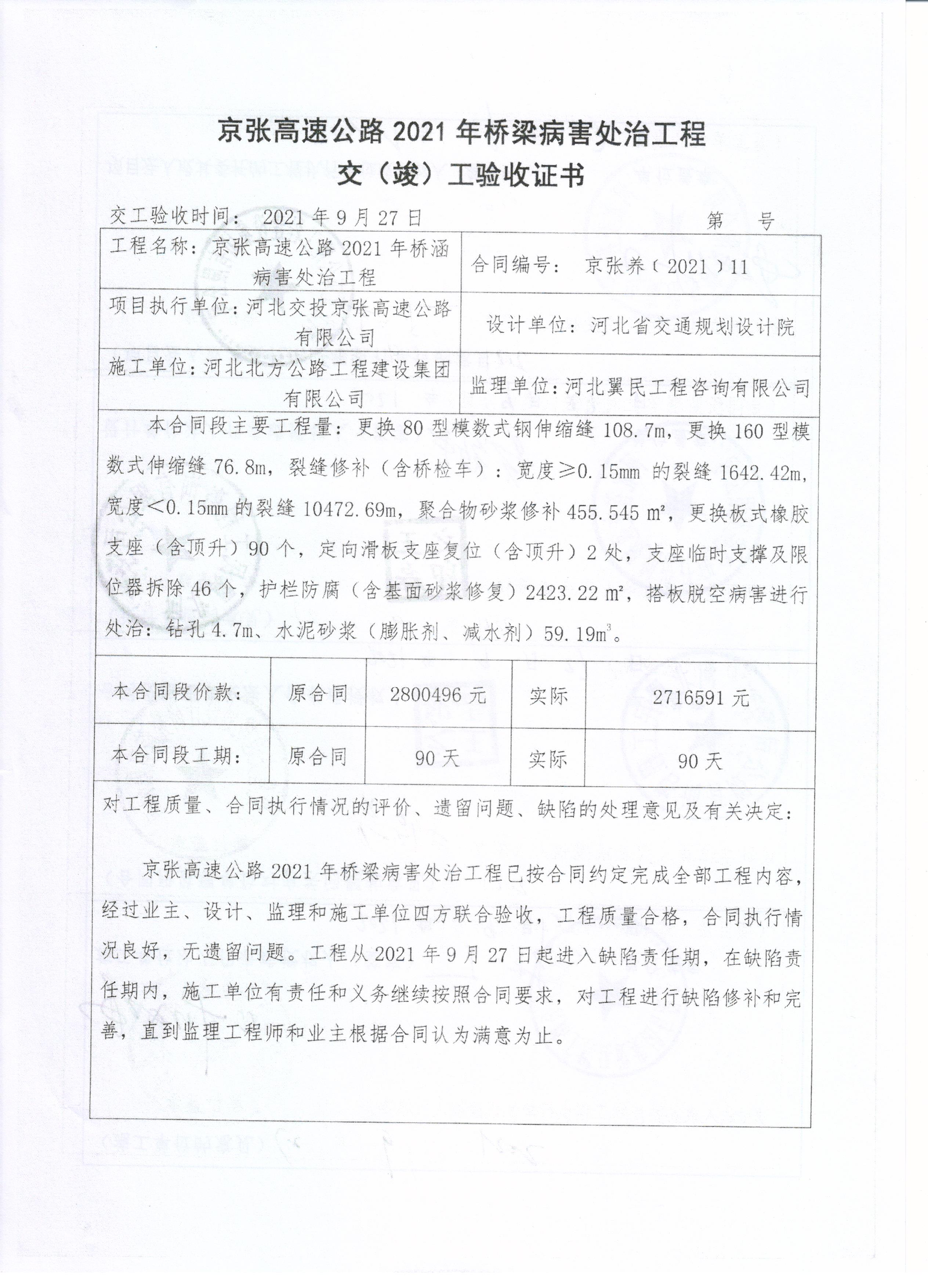 京張高速公路2021年橋梁病害處治工程交工驗收證書